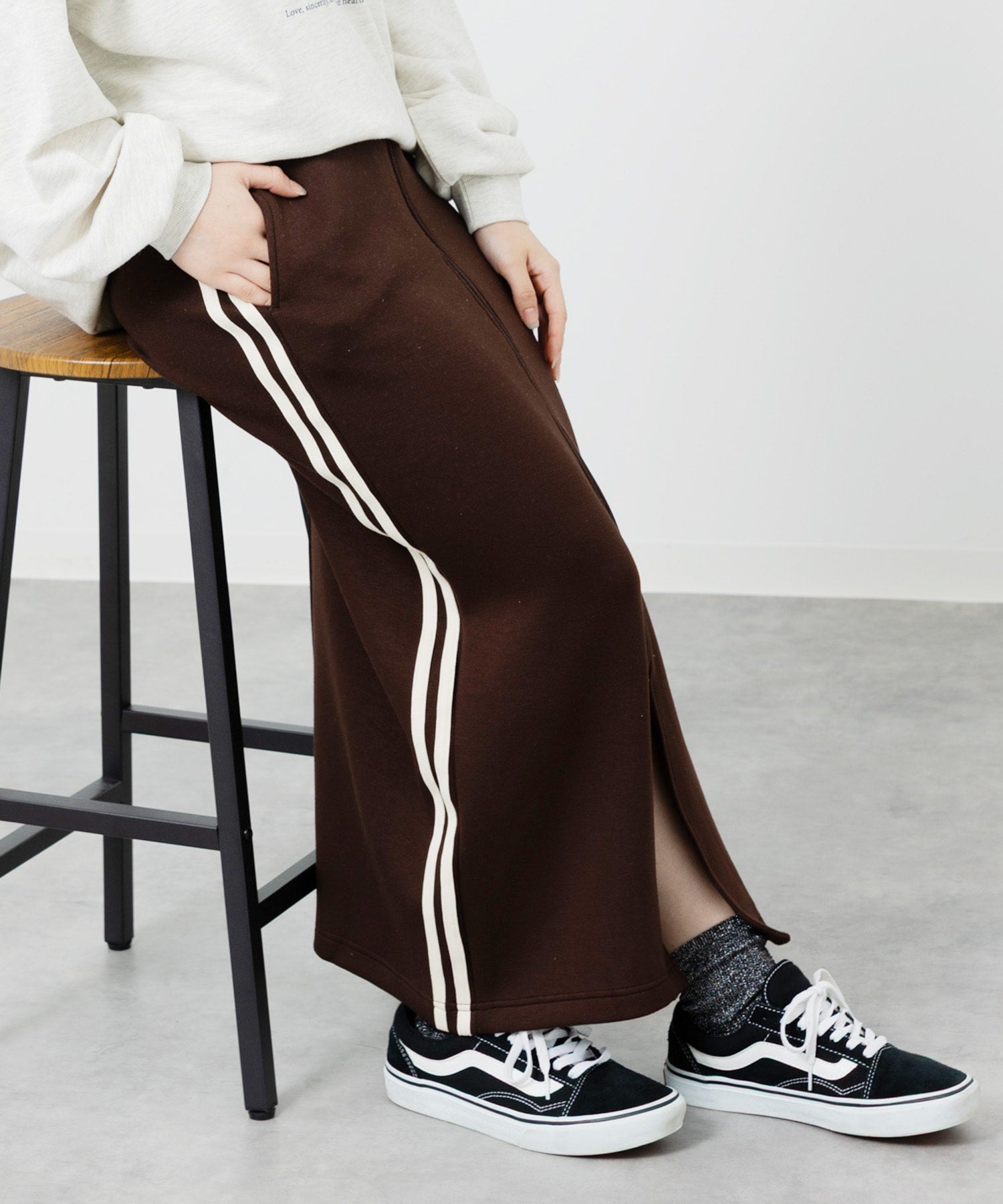 ほどよいハリ感と軽さが特徴のダンボールニット素材を使ったロングスカート!両サイドには配色ライン、バックスタイルにはスリットを入れて動きやすさもプラス。スポーティさとトレンド感をミックスしたデイリーに活躍する1枚!キッズサイズとのリンクも楽しめます!