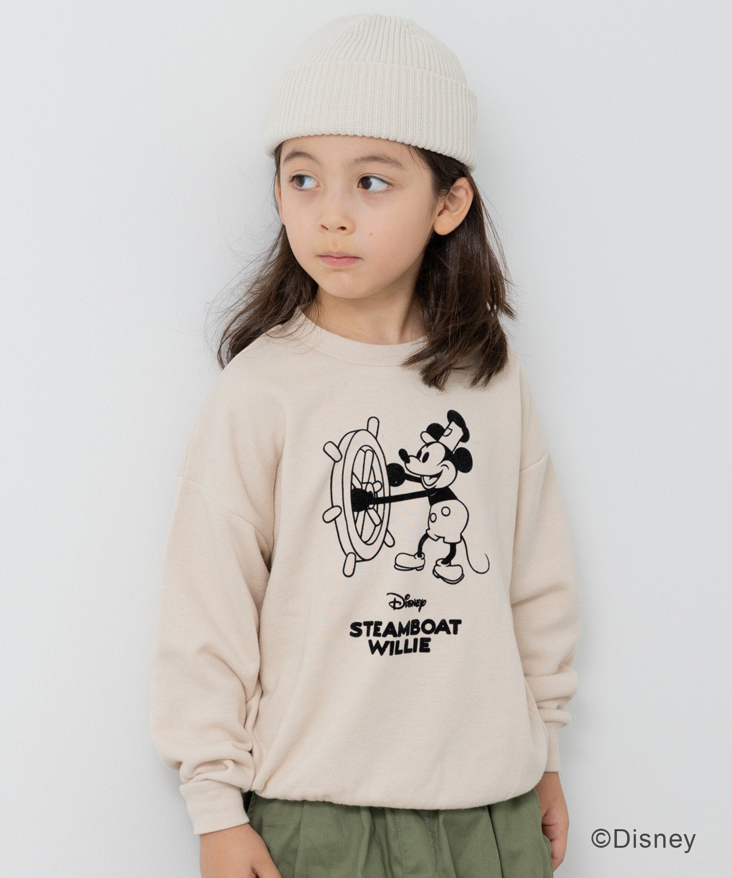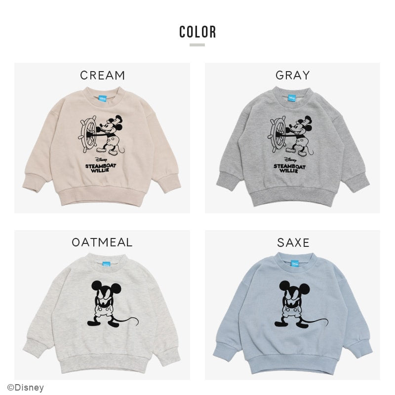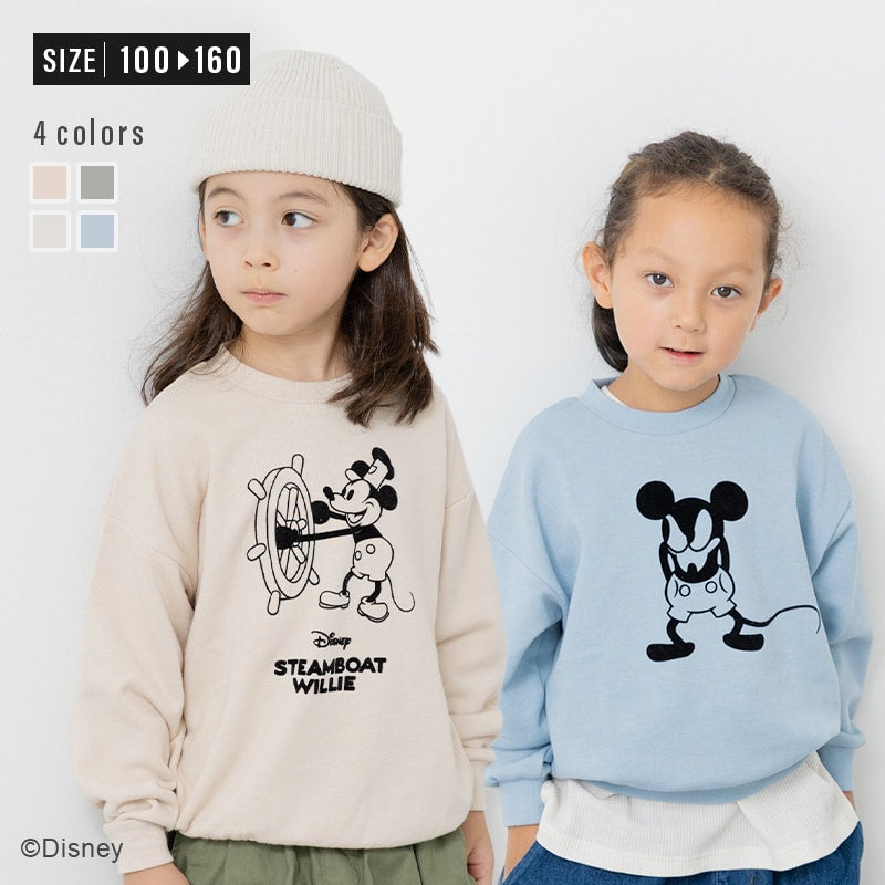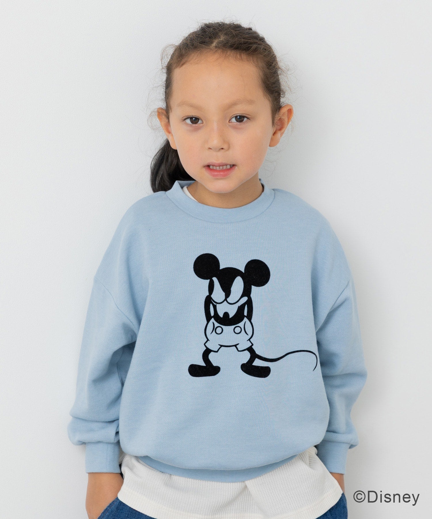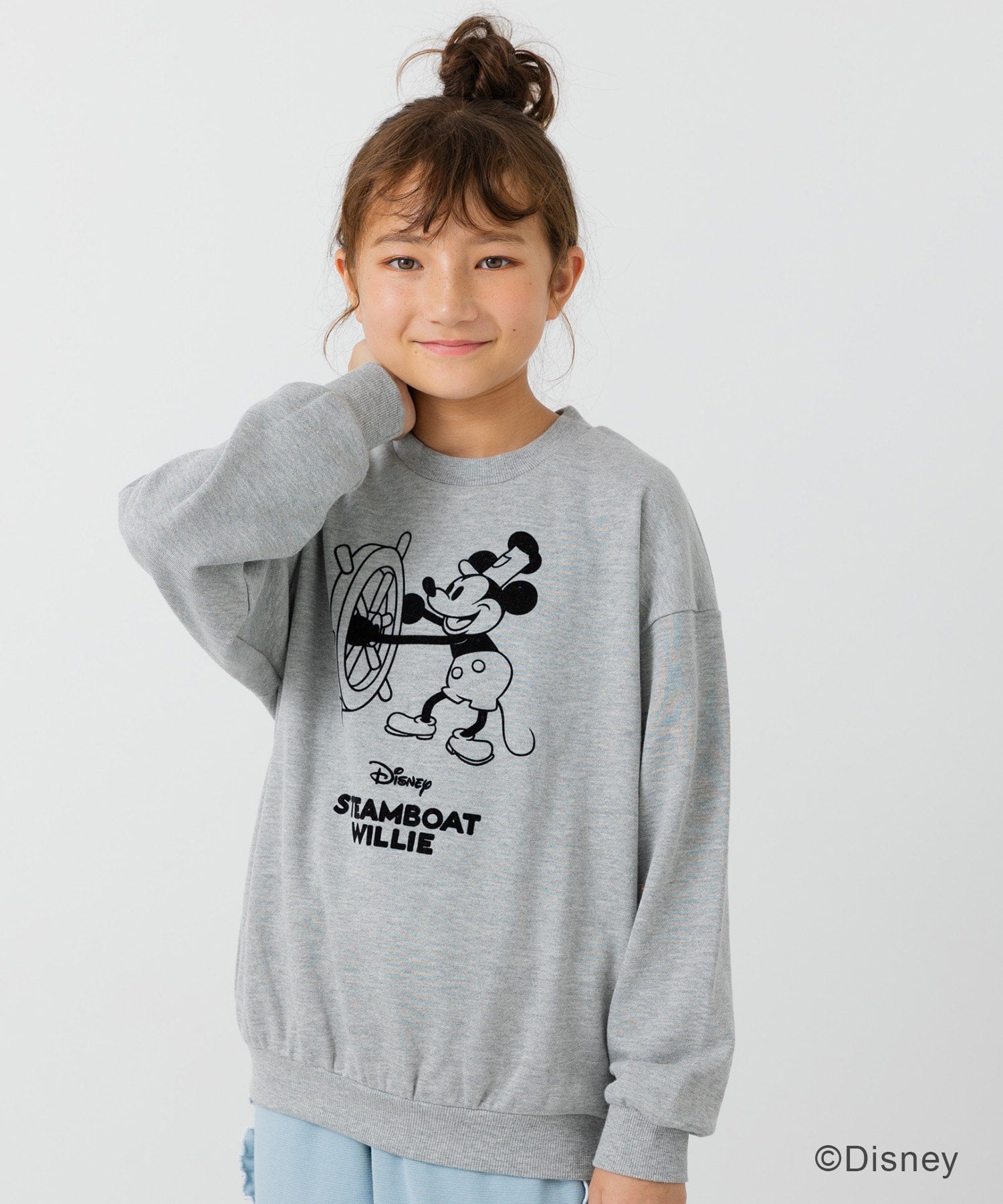 クラシカルな「ミッキーマウス」デザインの裏毛トレーナー!『蒸気船ウィリー』のアートをワンカラーのフロッキープリントで表現した、質感とヴィンテージ感が魅力の1枚。デイリーコーデにぴったりのゆったりとしたシルエットです。