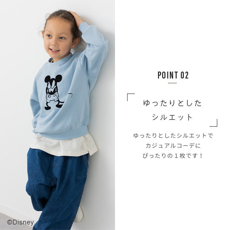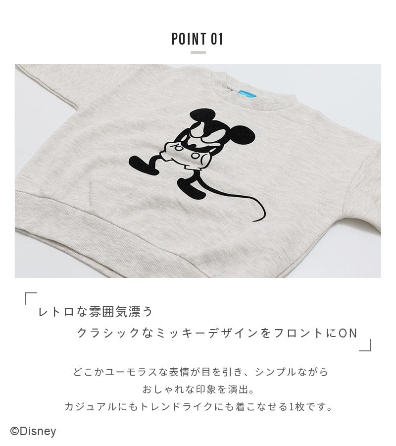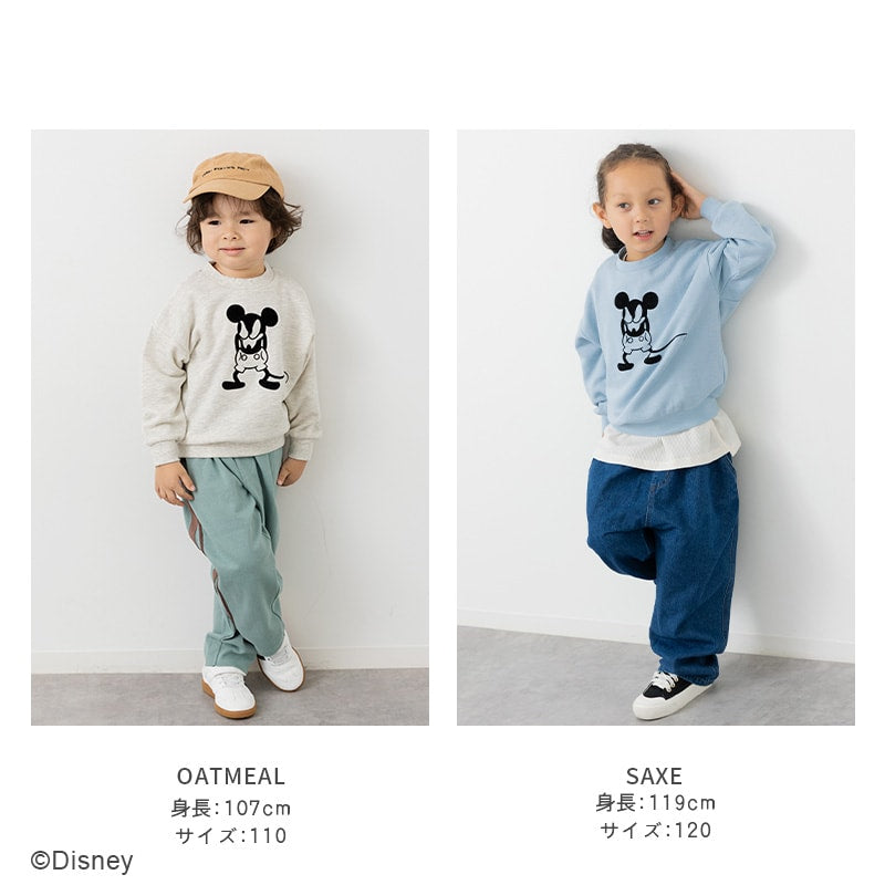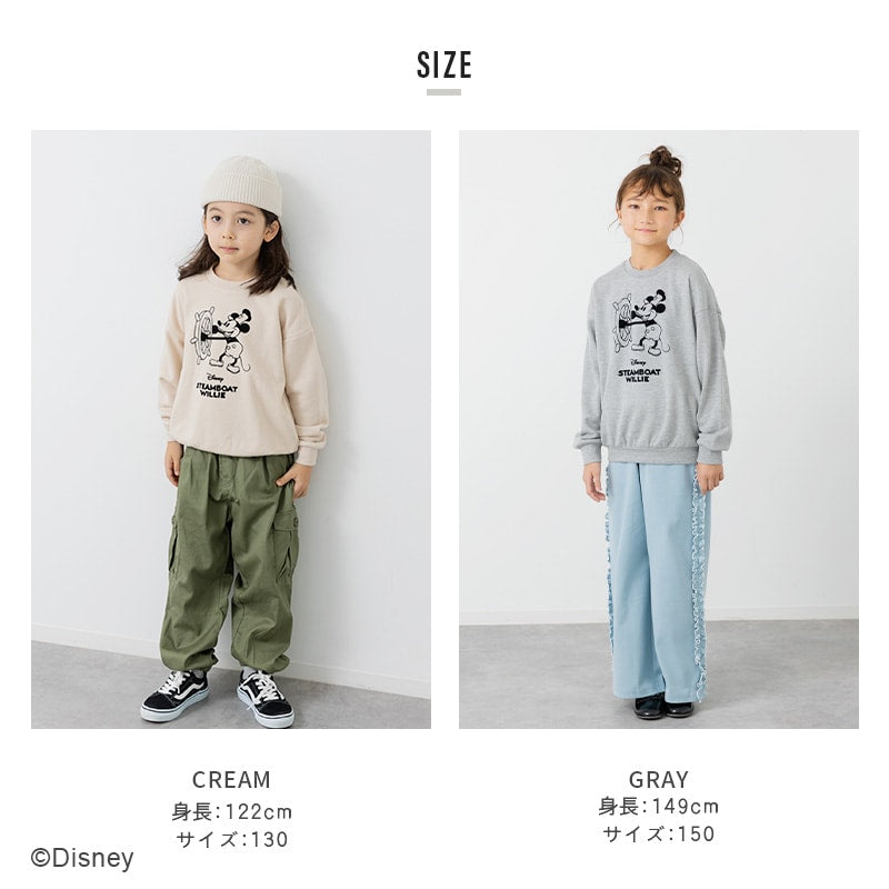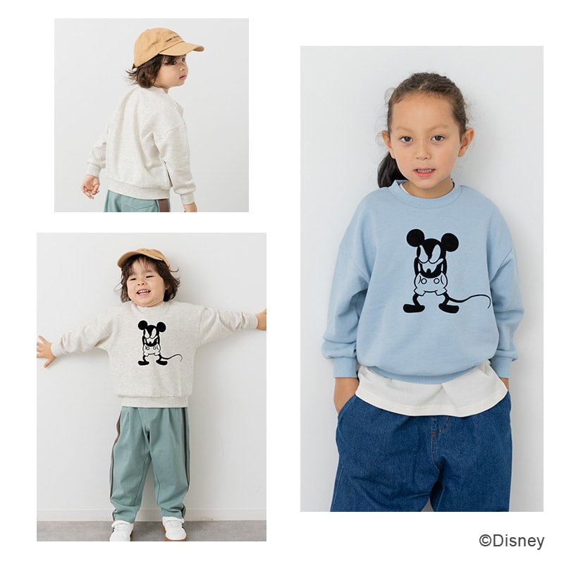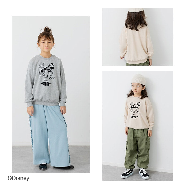 クラシカルな「ミッキーマウス」デザインの裏毛トレーナー!『蒸気船ウィリー』のアートをワンカラーのフロッキープリントで表現した、質感とヴィンテージ感が魅力の1枚。デイリーコーデにぴったりのゆったりとしたシルエットです。