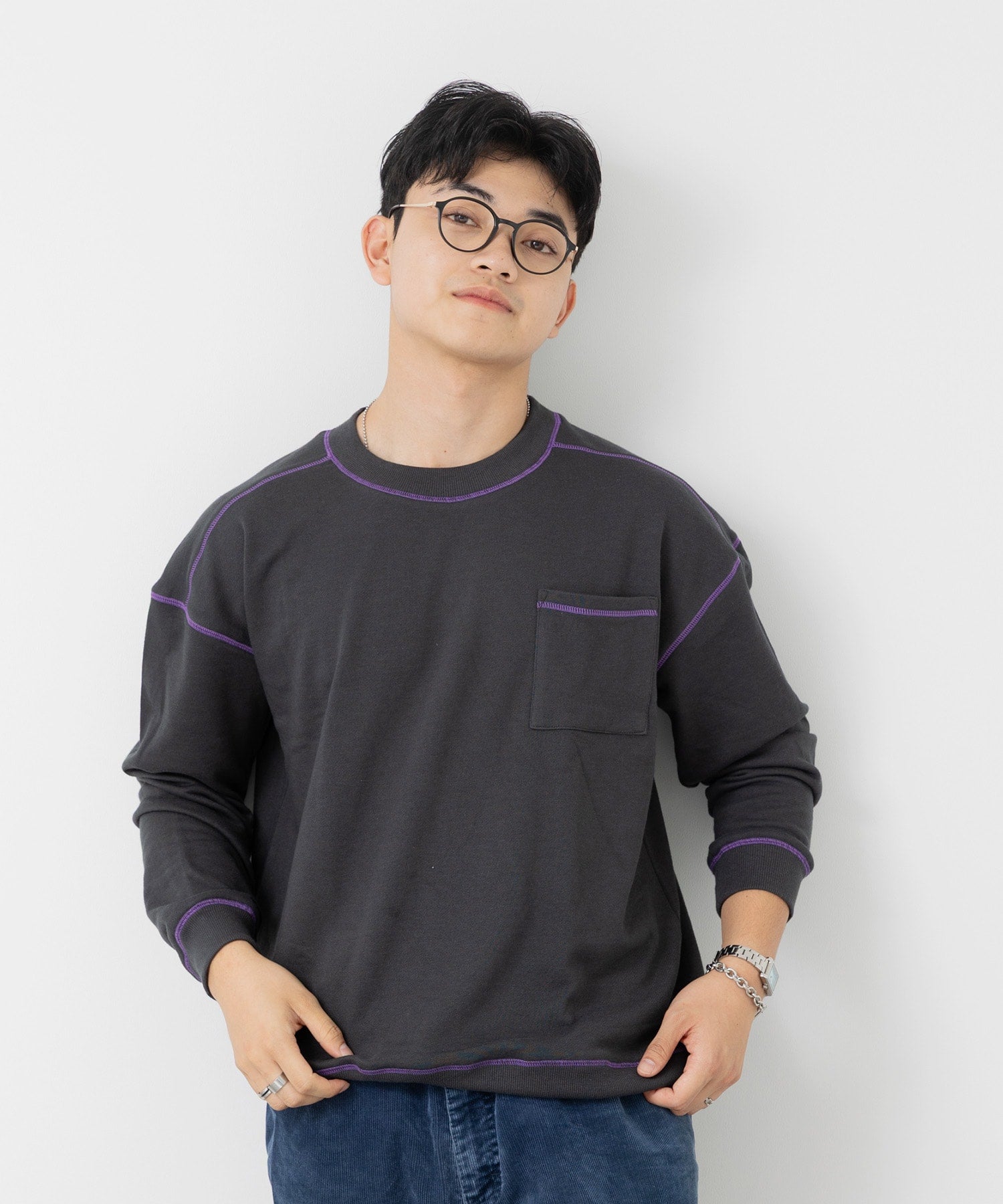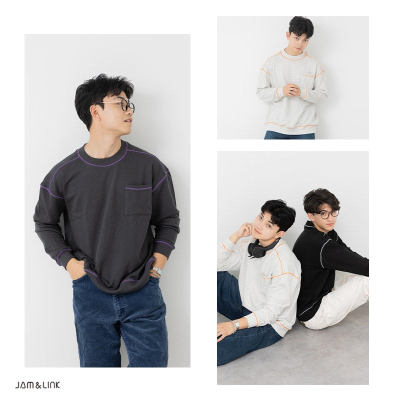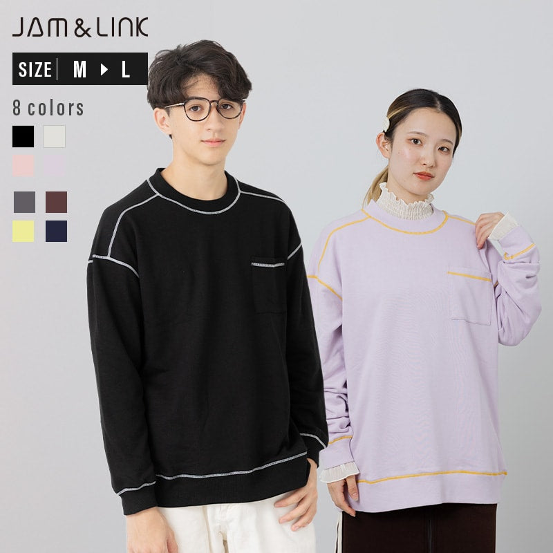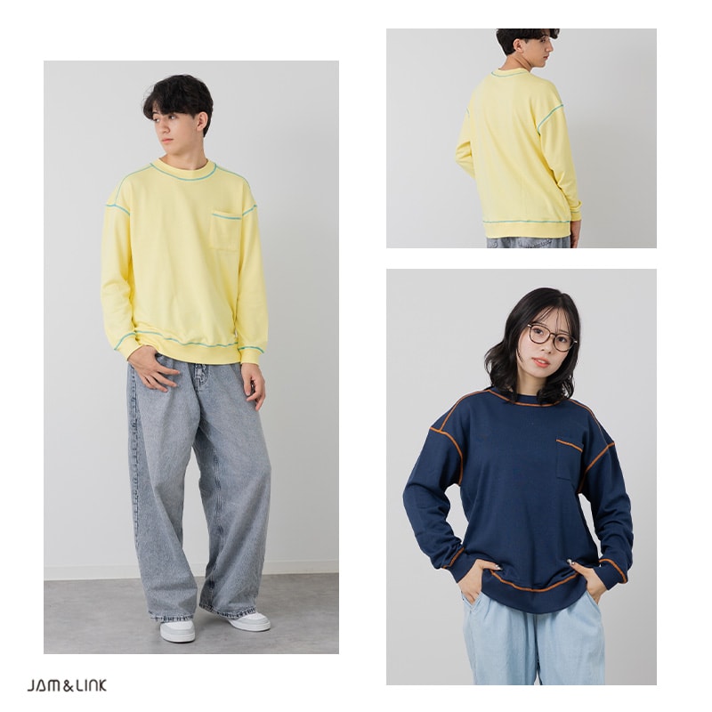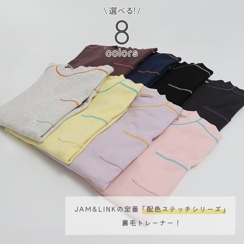 JAM&LINKの定番「配色ステッチシリーズ」の裏毛トレーナー!ステッチがほどよいアクセントになり、着るだけでシンプルなのにひとクセあるオシャレなコーデに仕上がります。ちょうどよい厚さの生地感で、秋口~春先まで長く着まわせるよ。