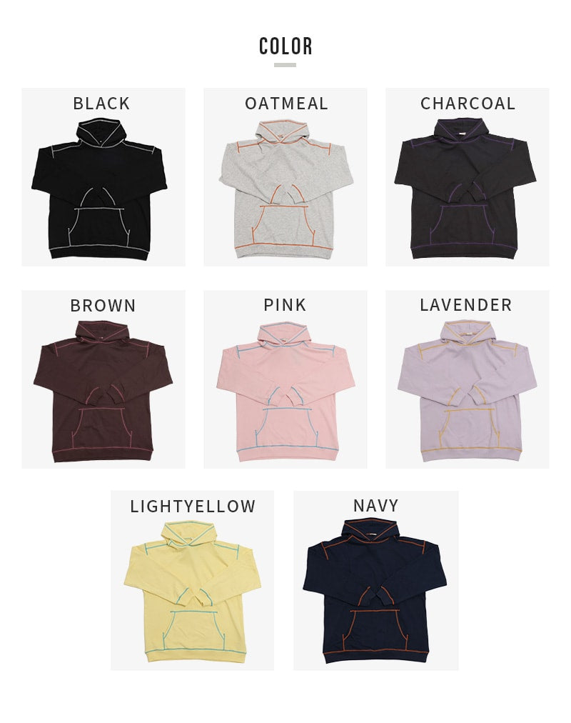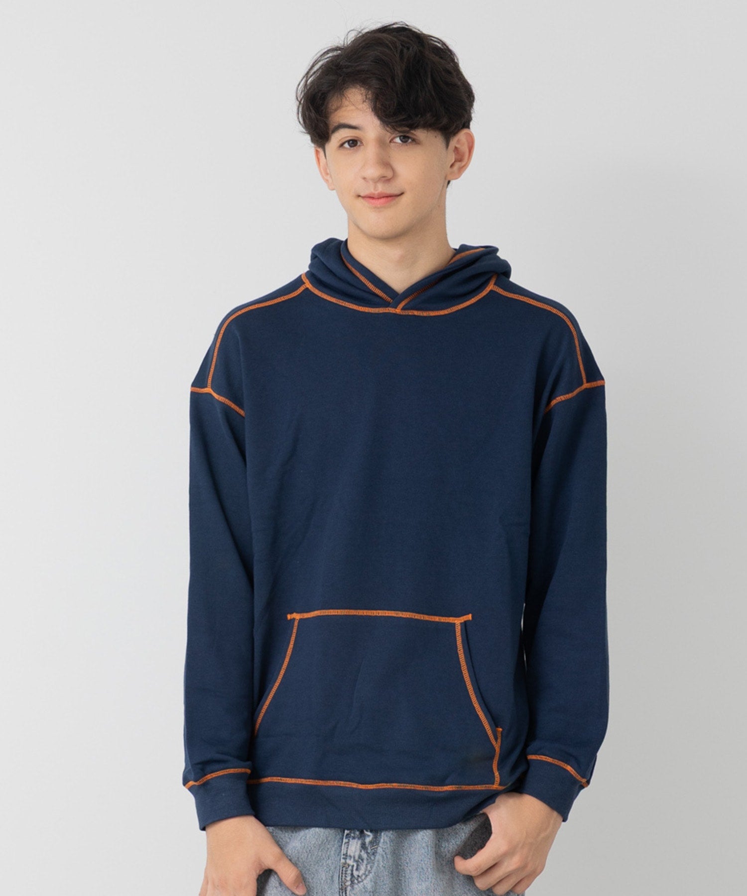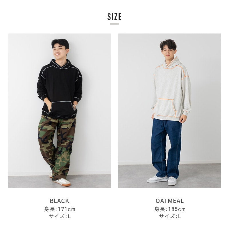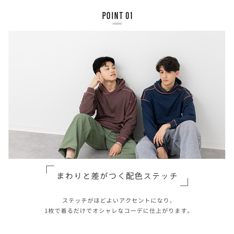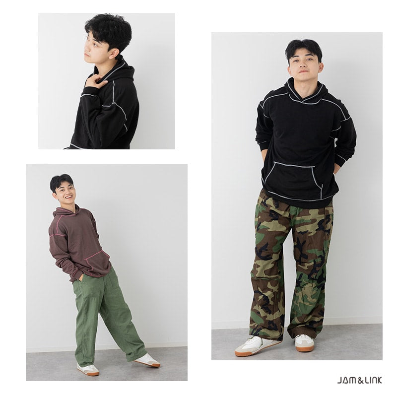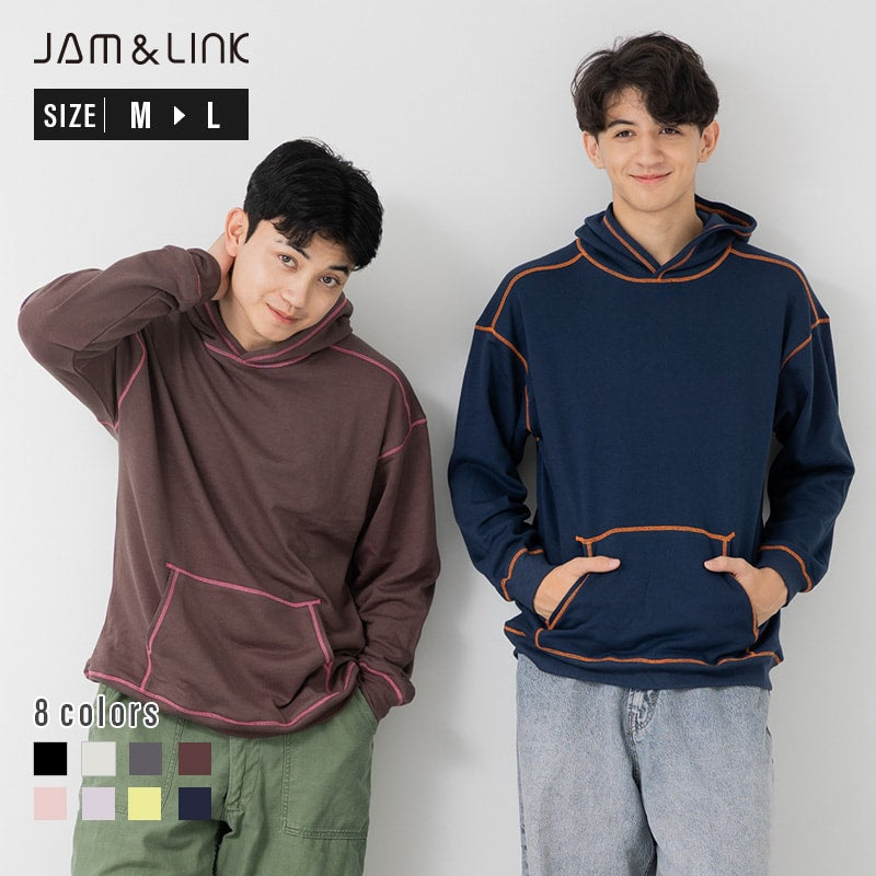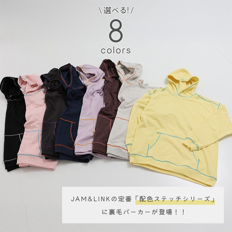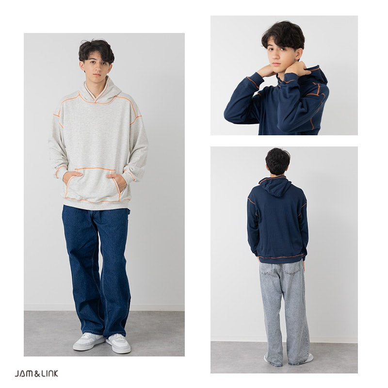 JAM&LINKの定番「配色ステッチシリーズ」に裏毛パーカーが登場!ステッチのカラーがアクセントになり、自然体だけどセンスのあるコーデが完成。ゆったりとしたシルエットで着心地も快適です。デイリーにはもちろん、ワンマイルウェアとしても活躍します。