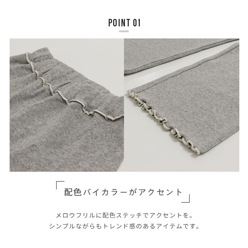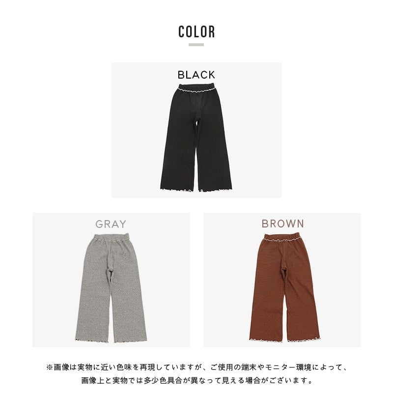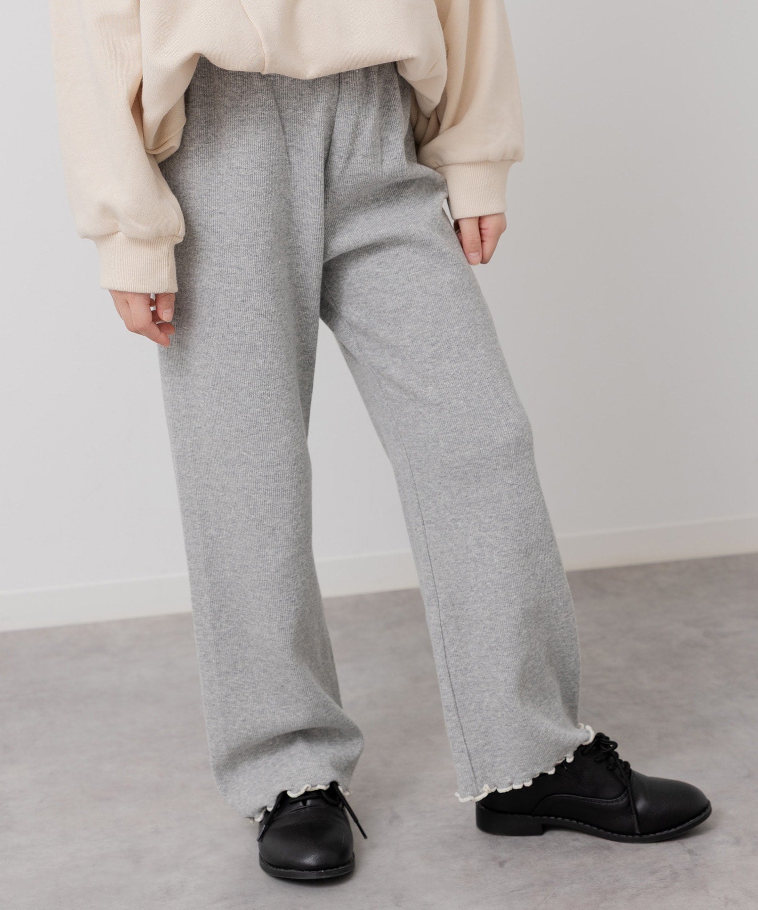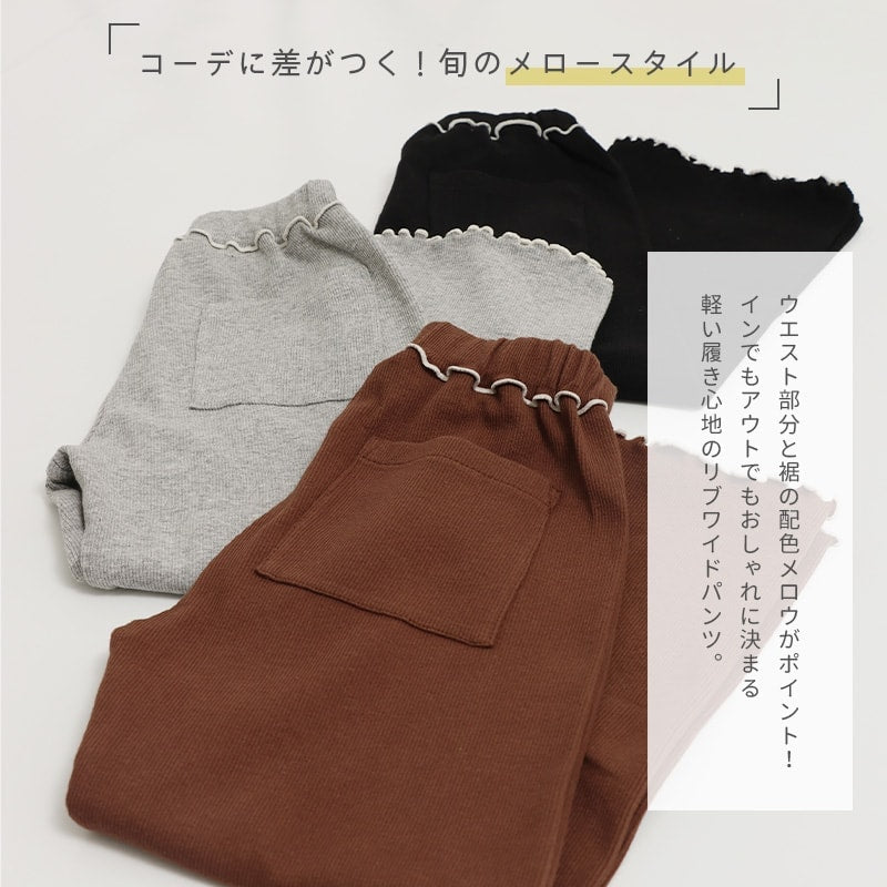 伸縮性バッチリの柔らかくて快適なリブのワイドパンツ。裾の配色メロウがデザインポイント!後ろには便利な片側ポケット付きで、シンプルな中にさりげないアクセントをプラス。リラックスとアクティブを兼ね備えたパンツです。