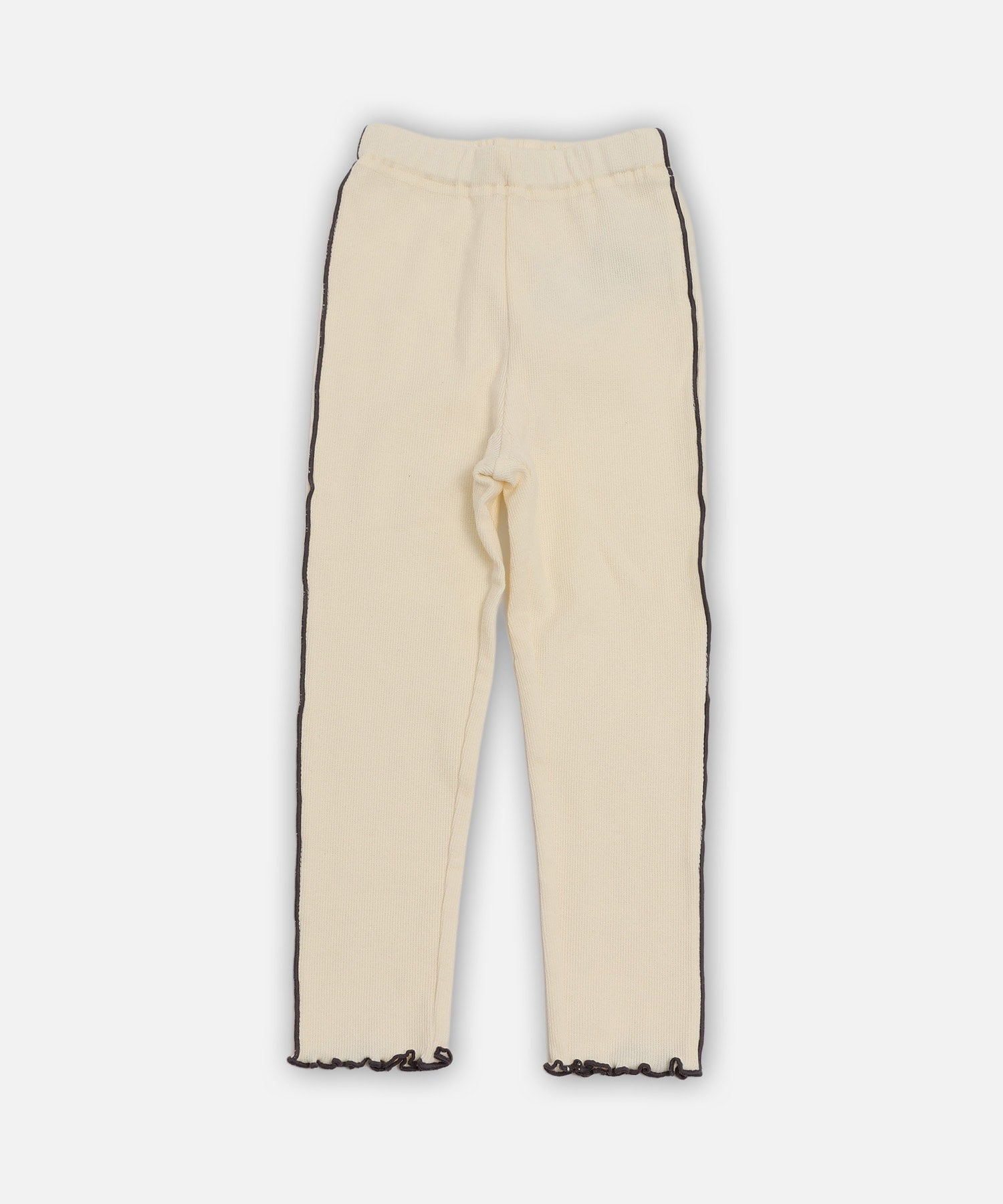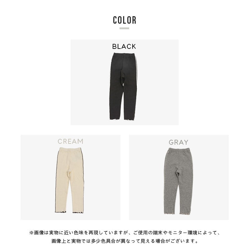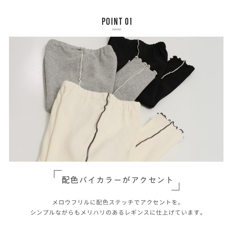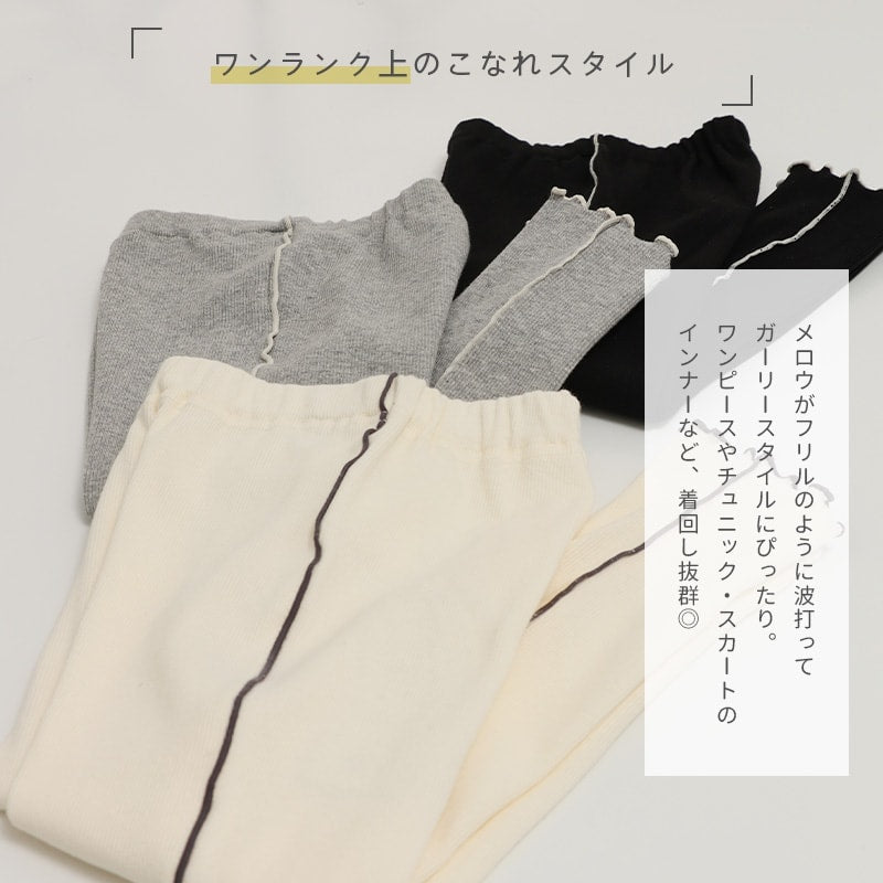 伸縮性バッチリの柔らかくて快適なリブレギンス!サイドの配色メロウがデザインポイント!メロウがフリルのように波打ってガーリースタイルにぴったり。ワンピースやチュニック・スカートのインナーなど、着回し抜群◎